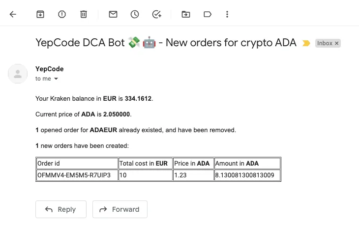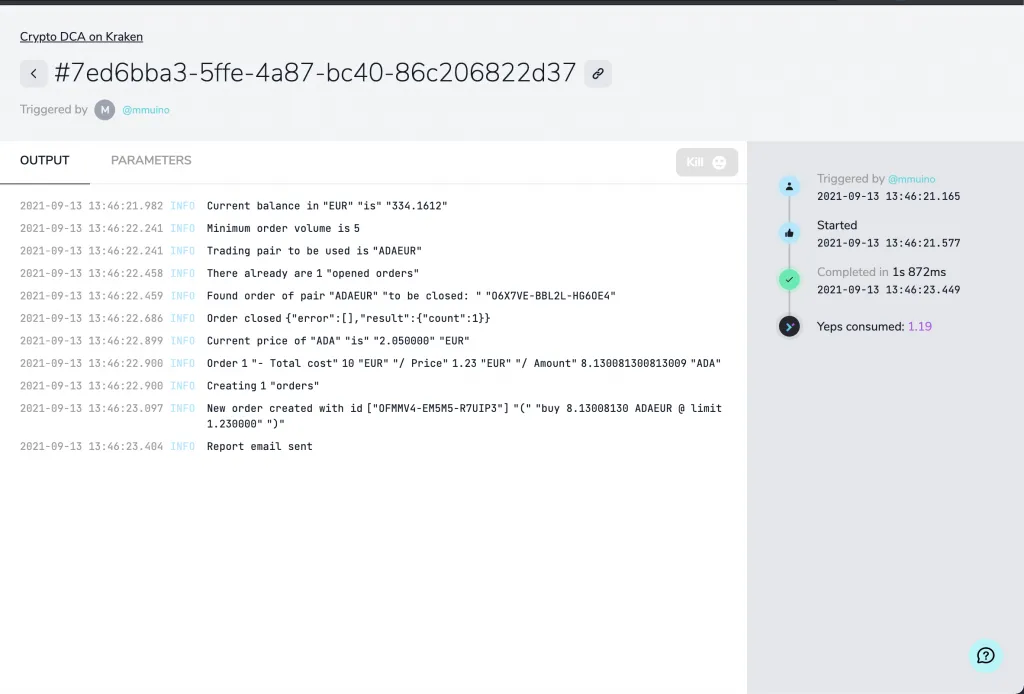await mailClient.sendMail({ from: "YepCode ", to: "cryptobuyer@gmail.com", subject: `YepCode DCA Bot - New orders for crypto ${parameters.cryptoCurrencyCode}`, html: mailHtmlContent})console.log("Report email sent");Having all this setup created, we could start a new on demand execution of the process, providing the requested parameters:
