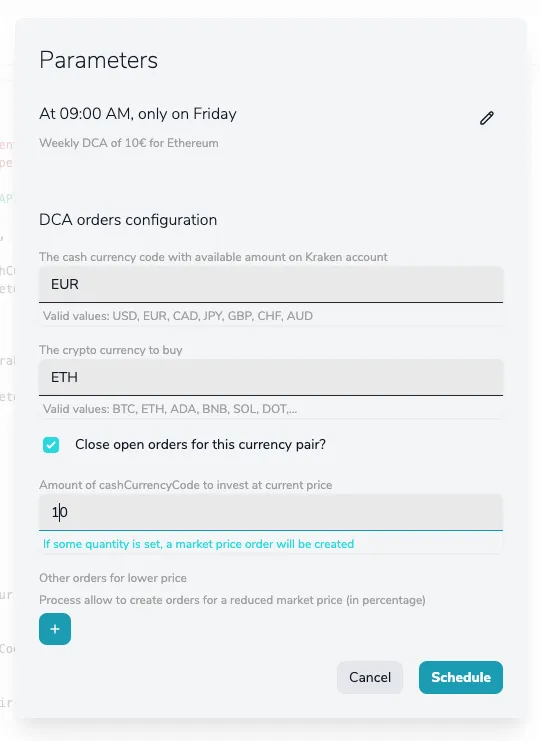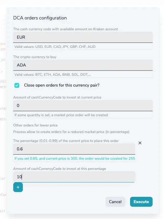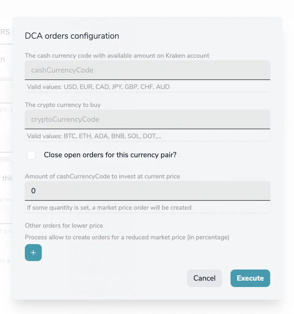 { "type": "object", "title": "DCA orders configuration", "properties": { "cashCurrencyCode": { "title": "The cash currency code with available amount on Kraken account", "description": "Valid values: USD, EUR, CAD, JPY, GBP, CHF, AUD", "type": "string" }, "cryptoCurrencyCode": { "title": "The crypto currency to buy", "description": "Valid values: BTC, ETH, ADA, BNB, SOL, DOT,...", "type": "string" }, "closeOpenOrdersForThisCrypto": { "title": "Close open orders for this currency pair?", "type": "boolean" }, "marketOrderQuantity": { "title": "Amount of cashCurrencyCode to invest at current price", "description": "If some quantity is set, a market price order will be created", "type": "number", "default": 0 }, "ordersBelowCurrentPrice": { "title": "Other orders for lower price", "description": "Process allow to create orders for a reduced market price (in percentage)", "type": "array", "items": { "type": "object", "properties": { "pricePercentage": { "title": "The percentage (0.01-0.99) of the current price to place this order", "description": "If you set 0.85, and current price is 300, the order would be created for 255", "type": "number", "default": 0, "min": 0.01, "max": 0.99 }, "quantity": { "title": "Amount of cashCurrencyCode to invest at this percentage", "type": "number", "default": 0 } } } } }, "required": [ "cashCurrencyCode", "cryptoCurrencyCode" ]}As a result, YepCode could build a form to be shown to the user on each new execution configuration:
