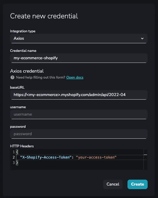 Here you have an example of Shopify credential creation: