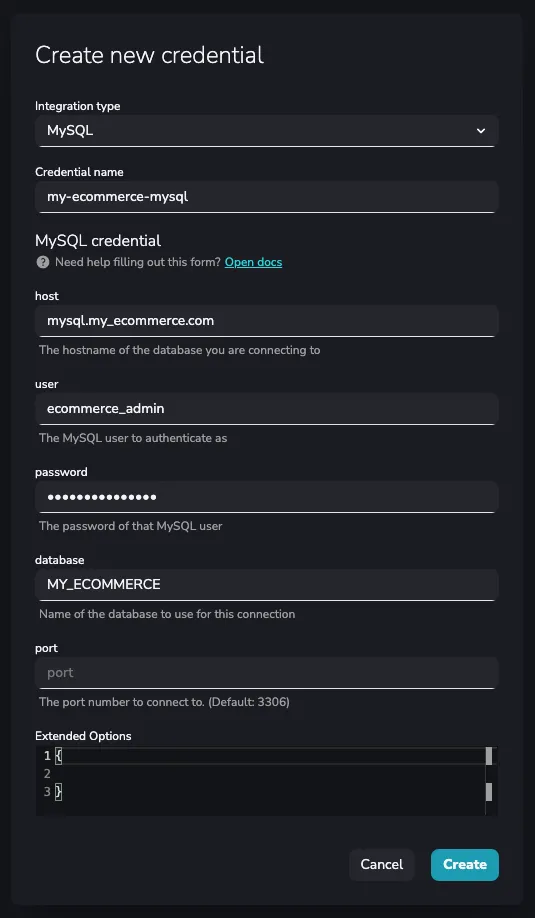 The same as for Shopify, you need a MySQL credential to be able to connect to your MySQL.Here you can see one example with the needed parameters for the MySQL credential.