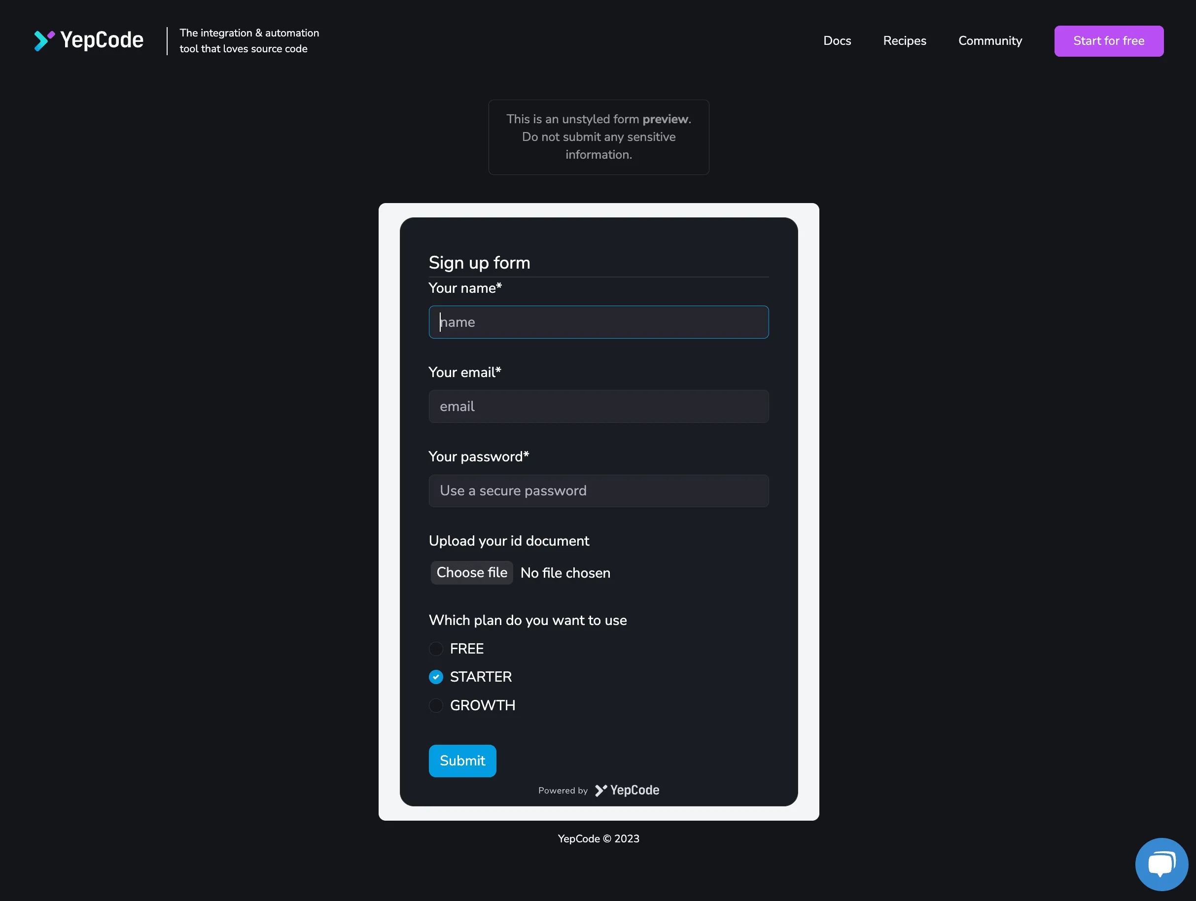 Getting started with YepCode forms is super easy. To begin, head over to the YepCode documentation page, where you’ll find detailed information on how these forms work and how to configure them. With YepCode Forms, you can easily trigger any type of YepCode process by asking users for input parameters. And the best part? You can embed these forms in any external website.