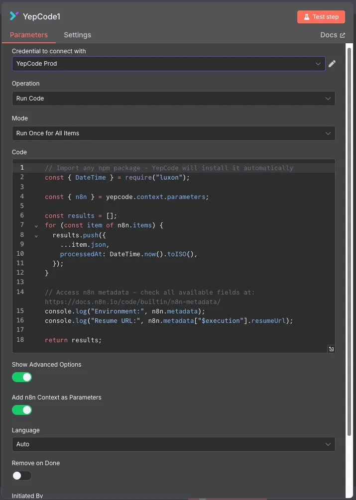 The Run Code operation can execute any JavaScript or Python code with any package. YepCode automatically installs dependencies as needed. Here’s an example that processes input parameters from previous n8n nodes:
