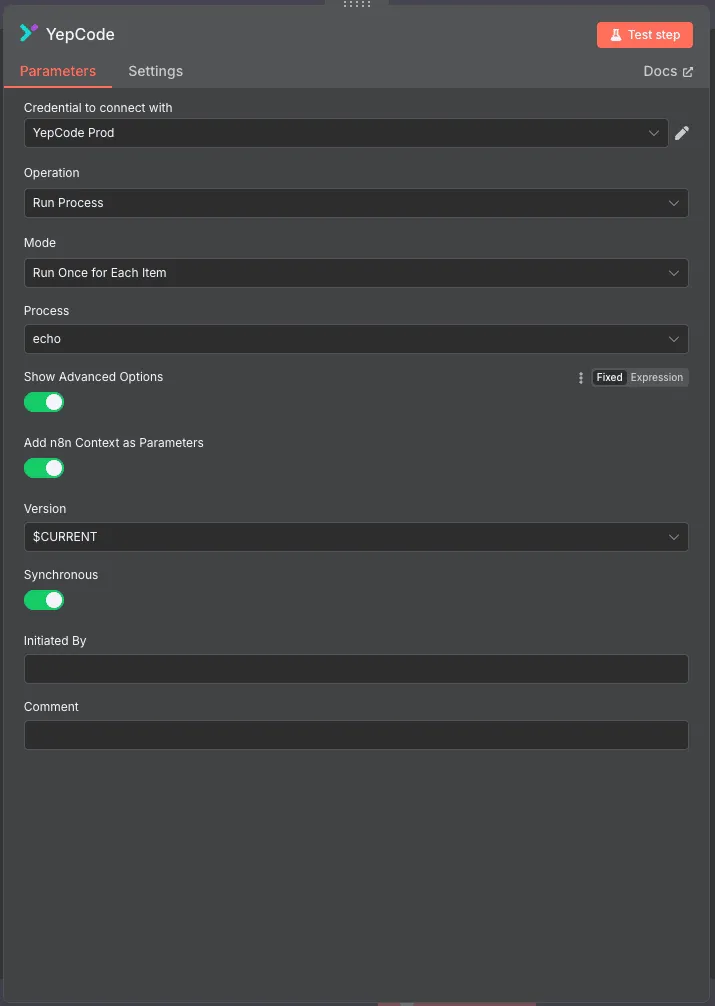 The screenshot below shows the n8n node configuration where you can select your YepCode process and configure the execution:
