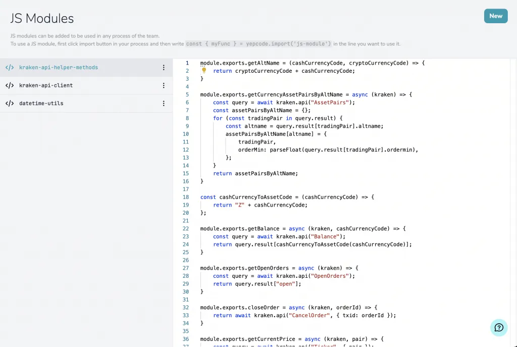 We’ll need all the code to interact with Kraken API. We could add all the implementation in this same process. But as it seems a quite reusable component, a better idea is to use the YepCode JS modules feature to create a new module with a Kraken API client implementation.