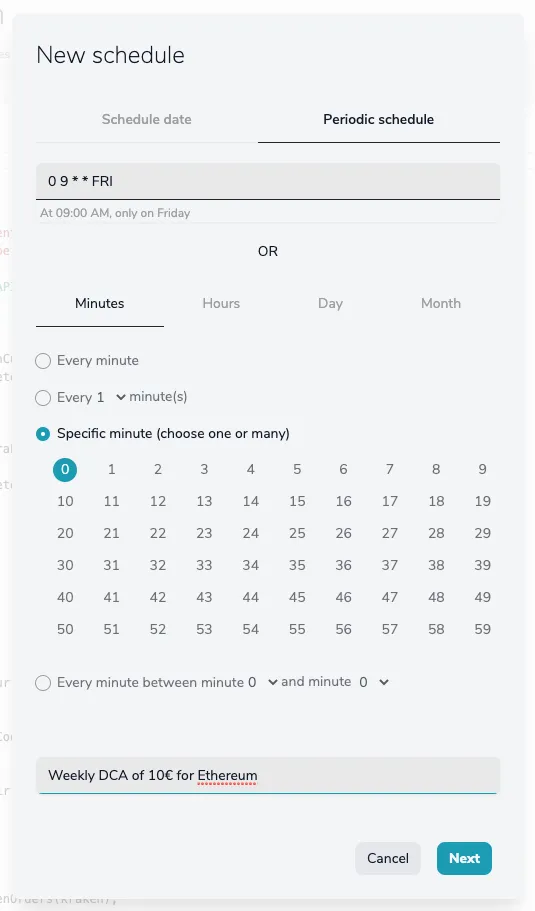 After being sure that everything works ok, and having done some on-demand executions, it’s time to create a scheduled execution configuration to take the most of DCA. Let’s create a new periodic execution on Friday’s morning:
