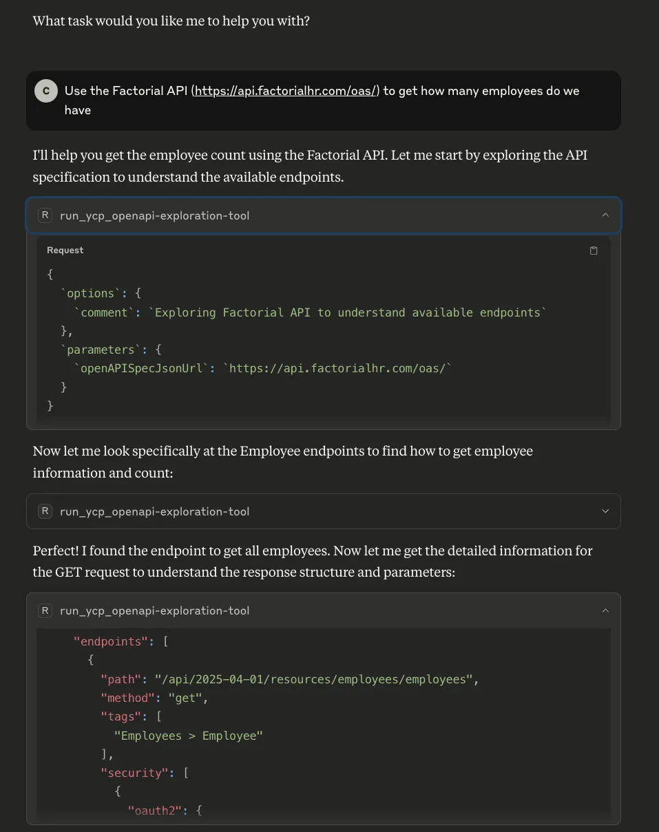 In this video, we show how to connect the dots using YepCode Run and MCP tools, automating interactions with Factorial’s REST API using nothing more than generated code and a bit of smart orchestration.